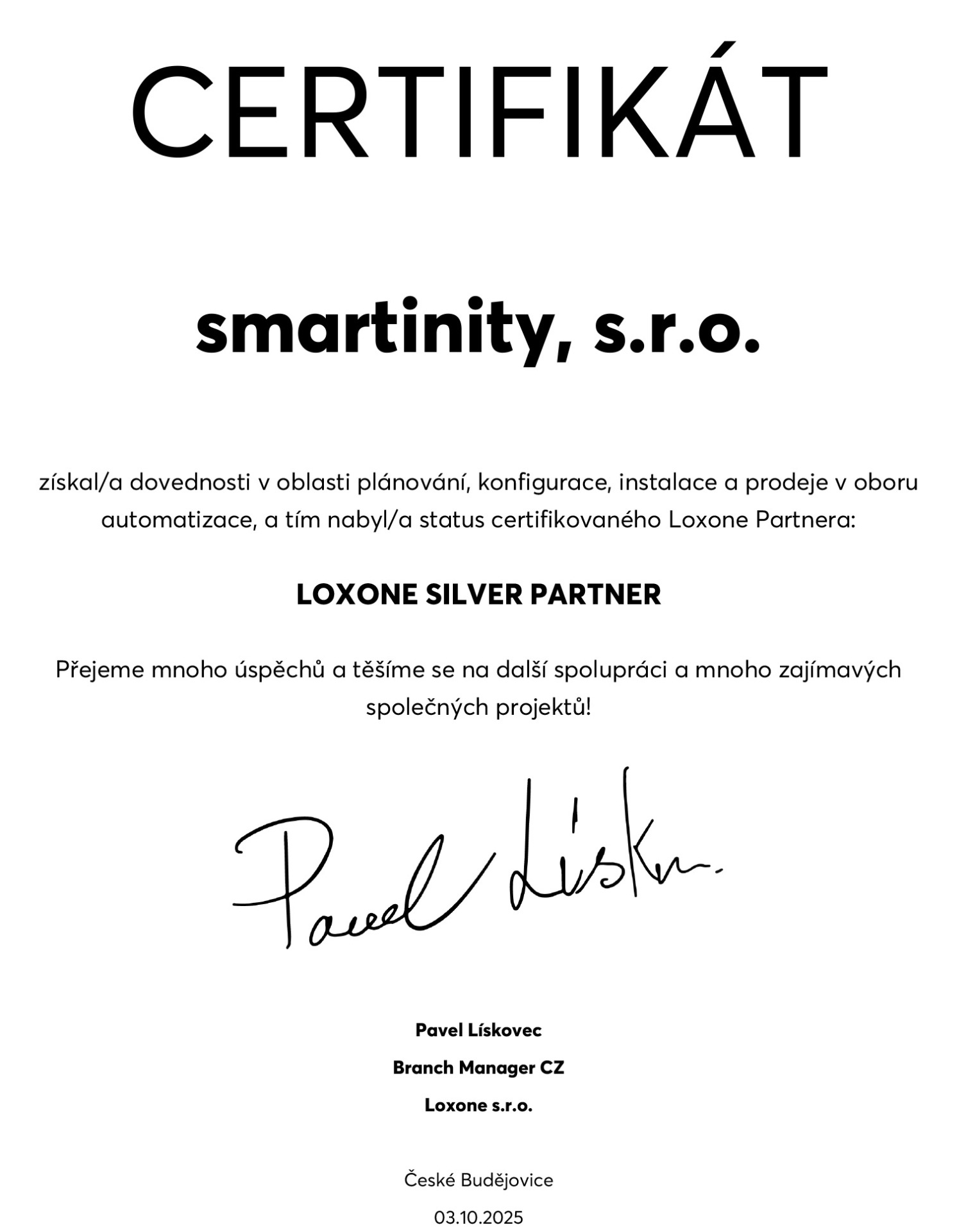 Získání statutu Loxone Silver Partner je pro nás potvrzením vysoké odbornosti v oblasti chytré automatizace budov.